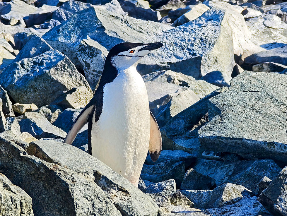 rocky outcroppings on the peninsular. The signature feature is the thin black chinstrap line under the head. Breed in extremely large colonies. Chicks fledge in March losing there down feathers. There are approximately 3.4 million pairs. Highly agile and fast. Diet includes krill, fish and squid.